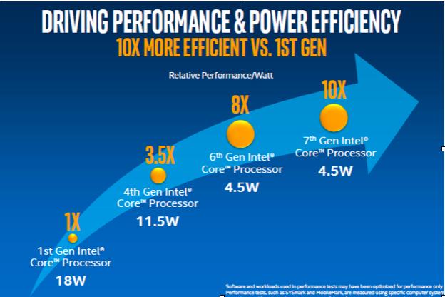 如果以第一代酷睿产品为标杆,第七代酷睿的性能提升 10 倍。
