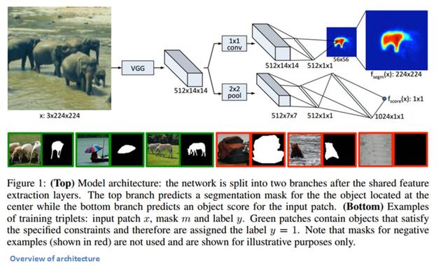Pedro Pinheiro, Roman Collobert 与 Piotr Dollar 写了一篇标题为「学习分割候选对象(Learning to Segment Object Candidates)」的论文。作者通过一个模型着手处理对象分割的任务。该模型在给定的一个图像补丁的情况下,首先输出一个分割掩码,然后再输出该图像补丁在完整对象上居中的概率。那个过程被应用在整个图象上以便每一个对象都可以得到一个创造的掩码。而这整个过程仅通过一个 CNN 来完成,因为在该网络中,这两个组件都共享了许多层。输入和输出