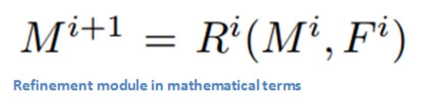 让我们深入挖掘下该精炼模块的特性。该模块的目标通过增采样将自下而上(你可以认为 DeepMas=bottom-up 和精炼模块=top-down)创造的特征图考虑在内的方式生成的掩码,对抗 DeepMask 通道中池化层的影响。看待它的一种数学方式是精炼模块 R 是一个生成增采样的掩码 M 的函数,掩码 M 是前面层中掩码的函数,也是特征图 F 的函数。使用的精炼模块的数量等于 DeepMask 通道中使用的池化层的数量。