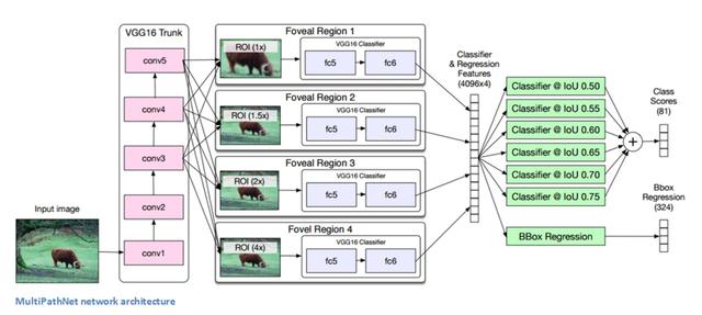 DeepMask 用来生成粗糙的分割掩码,SharpMask 用来精炼这些轮廓。而 MultiPathNet 的职责是在这些掩码中进行对象识别或者分类。包括 Sergey Zagoruyko、Adam Lerer、Tsung-Yi Lin、Pedro Pinheiro、Sam Gross、Soumith Chintala、Piotr Dollar 在内的几个人发表了一篇名为「A MultiPath Network for Object Detection」的论文。这篇文章的目的,是通过专注处理尺度变化、高度遮挡、杂乱的图片,以及更高的精度定位,来提高对对象的检测技术。这个模型是以快速 R-CNN(Fast R-CNN)为起点的。总的来讲,这个模型应用了快速 R-CNN 以及 DeepMask 和 SharpMask 的对象检测技术。这篇论文的三个主要贡献之处是:忽略连接(skip connections)、黄斑区域(foveal regions)和一个积分损失函数(integral loss function)。在详细介绍这三个方法之前,我们先来看看这个网络的架构。