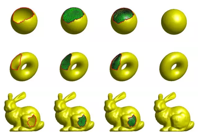 检测孔洞边界和初始化补洞网格方法与以前介绍的方法相同。由于初始化补洞网格无法与原始孔洞周围的网格有效融合,因此需要调整补洞网格的顶点位置使得补洞网格与原始网格之间光滑过渡。