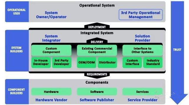 该框架从工业世界的3个角色看待安全:打造硬件和软件的组件创建者,使用硬件和软件来构建解决方案的系统创建者,以及解决方案和系统的操作用户。工业用户需要解决整个系统的可信度问题。