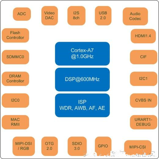 5、高集成、高扩展:支持多Camera sensor输入,HDMI OUT/CVBS OUT/CVBS IN/Audio Codec。