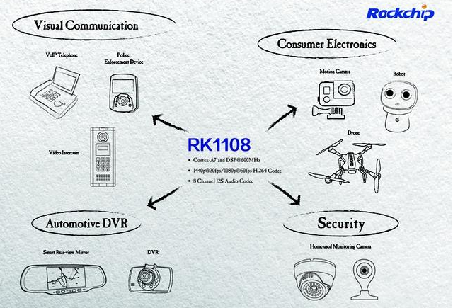 另外,在其音频、视频编码、系统平台方面,RK1108表现可圈可点。音频技术方面,可实现多路MIC阵列、噪声抑制、回声消除、声源定位、主声跟随、智能语音处理能力(MIC阵列的算法),可极大提升监控系统、摄像头、对讲系统、VOIP可视电话等语音质量。视频编码方面,RK1108编解码均可实现2K/H.264画质,配合移动侦测、人脸识别、微光夜视,在汽车安全、无人机、安防、360度运动摄像机等领域,新技术应用获得的效果提升显著。而在开发者关注的系统平台上,RK1108基于Linux OS,支持MiniGui和其他UI、可内嵌WiFi/BT/GPS驱动、支持手机互联 (Android/IOS),这能为开发者提供更友好和深度的二次开发环境。