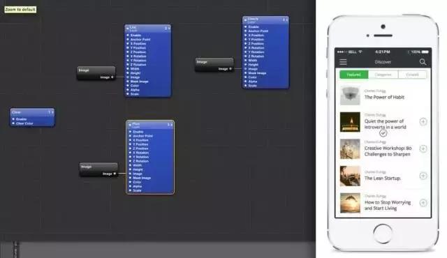 类似可视化编程的模式展示,所有操作几乎只需要拖动连接即可,极大提高了工作的效率,操作起来也十分方便快速,因此也被设计师成为“动效神器”。