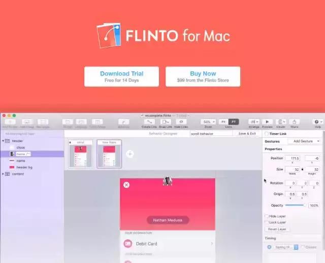 这个软件的和上面的flinto有点类似,界面和sketch类似,同时配合sketch也是非常方便。它主要是做2个页面间过渡专场特效,元素切换,细节动效的工具。优点很明显,效率高,质感好,缺点就是不能做整套原型。