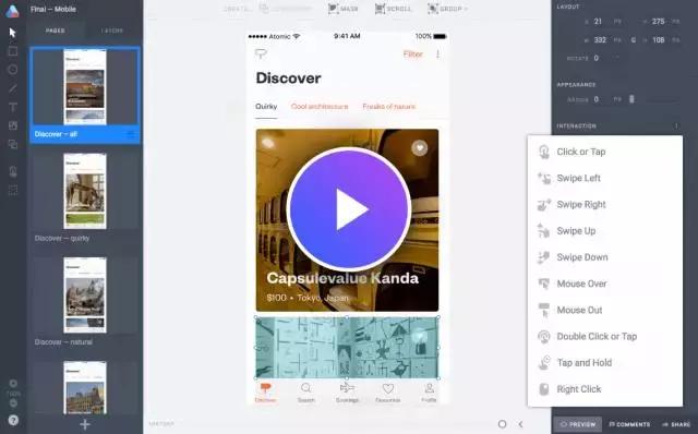 界面跟Sketch很像,如果会用sketch那么上手很快。能够快速实现各种滚动、转场、点击反馈效果。手机和电脑端的预览都非常的流畅。貌似现在用的人不少,下图是demo:
