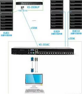 由于机房内60台服务器分散在10个机柜,每个机柜放6台服务器,所有可以采用在单独的每个机柜内配置一台传统的模拟类KVM型号为KS-2008UP,由于需要进行统一管理,所以需要配一台KVM将这10个机柜内的8口KVM树状级联起来,这个时候考虑连接距离的问题,传统的模拟类KVM已经不能满足需求了,所有本方案采用一台16口数字KVM型号为KS-2016C作为顶层进行树状级联的,每台8口KVM连接VGA-US-01计算机接口模块,通过标准网线连接至数字KVM主机,连接距离最远可以达到50米;