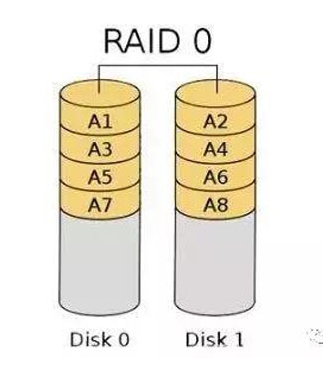 RAID 0:如果你有n块磁盘,原来只能同时写一块磁盘,写满了再下一块,做了RAID 0之后,n块可以同时写,速度提升很快,但由于没有备份,可靠性很差。n最少为2。