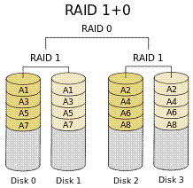 raid10:就是raid1+raid0,比较适合速度要求高,又要完全容错,当然¥也很多。最少需要4块硬盘(注意:做raid10时要先作RAID1,再把数个RAID1做成RAID0,这样比先做raid0,再做raid1有更高的可靠性)。
