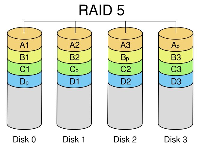 RAID 3:为了说明白RAID 5,先说RAID 3,RAID 3是若你有n块盘,其中1块盘作为校验盘,剩余n-1块盘相当于作RAID 0同时读写,当其中一块盘坏掉时,可以通过校验码还原出坏掉盘的原始数据。这个校验方式比较特别,奇偶检验,1 XOR 0 XOR 1=0,0 XOR 1 XOR 0=1,最后的数据时校验数据,当中间缺了一个数据时,可以通过其他盘的数据和校验数据推算出来。但是这有个问题,由于n-1块盘做了RAID 0,每一次读写都要牵动所有盘来为它服务,而且万一校验盘坏掉就完蛋了。最多允许坏一块盘。n最少为3。