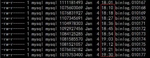 转换后,发现主从延迟逐渐增大,基本每天落后主机大概50个binlog左右,大概延迟7.5个小时左右的数据,主机每天大概产生160个binlog,binlog列表如下图所示: