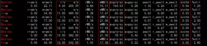 从IO情况看也没什么问题,单个IO延迟很小,IOPS很低,写带宽也不大。调度规则(cat /sys/block/fioa/queue/scheduler)和块大小等和主机设置是一样的,排除掉磁盘的问题。