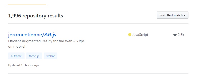 1.首先需要先到github上搜索ar.js,如下图,有2.8K star的就是了。