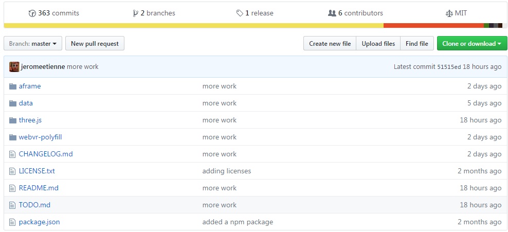 咱们的例子主要在这个开源库上更改,它的一级目录,aframe data three.js webvr-polyfill,一看就很清晰了,今天咱们单刀直入,只看three.js部分,当然也要依赖于data目录里的数据。