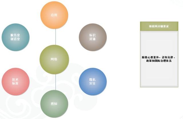 物联网发展的关键要素包括由感知、网络和应用层组成的网络架构,物联网技术和标准,包括服务业和制造业在内的物联网相关产业,资源体系,隐私和安全以及促进和规范物联网发展的法律、政策和国际治理体系。