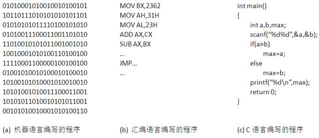写程序也叫编代码,用什么语言编呢?用机器语言编的01串,机器可以直接运行,运行效率高,但编写和维护都很困难。有人想到,如果保留机器指令的结构,用便于记忆和理解的符号和名字(字母和10进制数字组成的字符串),去一一对应操作码和地址,写好后再通过查指令清单去转换为01串,肯定要易于编写和维护。至于如何查找和转换,其实这正是计算机所擅长的,编写一个这样的转换程序即可,这种思想下的语言就是汇编语言,转换程序就是汇编器(汇编语言操作符号的字符串与机器语言操作码的01串是一一对应的关系)。更进一步,用更抽象更接近自然语言的语句和数据结构来描述操作符号和变量名字,就是高级语言和编译器(或解释器)。
