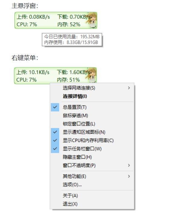 Traffic Monitor是一款用于Windows平台的网速监控悬浮窗软件,可以在电脑状态栏显示实时网速、CPU、内存,超简单实用的小工具,支持更换皮肤、历史流量统计等功能,而且是免费开源的软件。