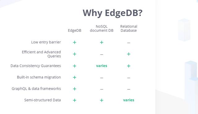 EdgeDB不是传统的对象数据库。尽管“object-relational”中有“object”这个词,但它不是OOP持久性或封装的实现。它具有表达式查询语言EdgeQL,其目标是匹配并超越现代SQL功能,如子查询,高级聚合和窗口函数。