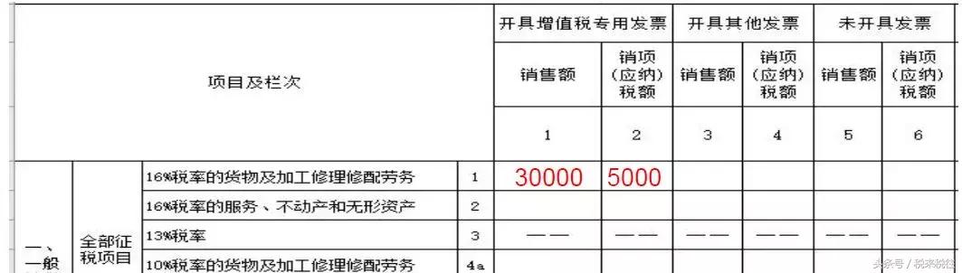 【例】在2018年6月申报时,按17%税率开具的发票,销售额20,000元,销项税额3,400元;按16%税率开具的发票,销售额10,000元,销项税额1,600元。本期销售收入共30,000元,销项税额5,000元。