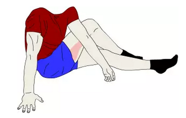 起始位置:平躺并弯曲右膝,把右腿放在左腿上。把左手的手肘放在外展肌上,然后用右手轻轻支撑。