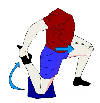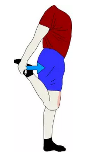 动作:抓住右脚踝,拉向臀部,试着用脚后跟碰到臀部。然后按压臀部,直到右腿和左腿感到拉紧,坚持30秒,然后换另一条腿。