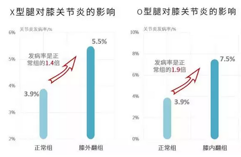 另外,O型腿X型腿等腿型问题,也会导致膝盖内外侧压力不平衡,形成膝关节疼痛或关节炎④。