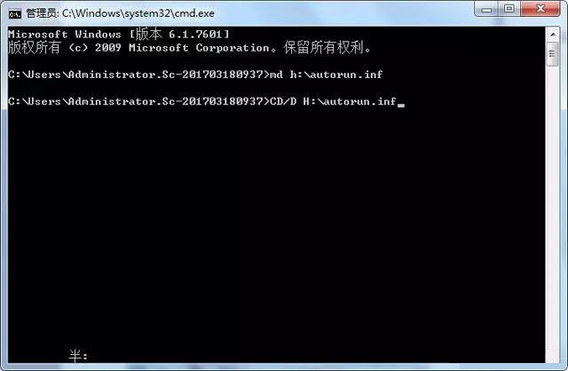 4、接着继续输入“cd /d H:autorun.inf”然后回车