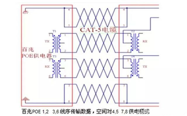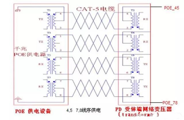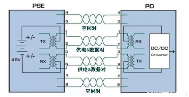 下图为利用空闲线(4,5,7,8)传递48V的电源。