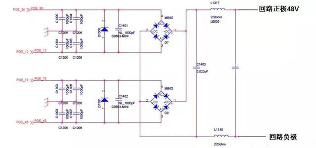 1000M BASE-T POE 供电系统 4个线序对均传输数据,故无空闲对, 均采用数据对供电,图六,1脚和2脚、3脚和6脚通过网络变压器进行电压、信号的分频、分离出来的电压连接到桥式整流进行整流供电,如图八