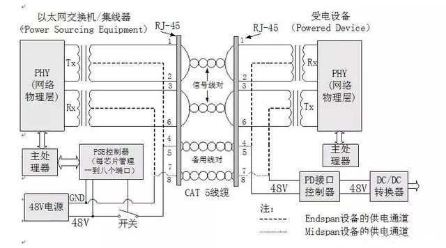 标准不允许同时应用以上两种情况。电源提供设备PSE只能提供一种用法,但是电源应用设备PD必须能够同时适应两种情况。该标准规定供电电源通常是48V、13W的。PD设备提供48V到低电压的转换是较容易的,但同时应有1500V的绝缘安全电压。