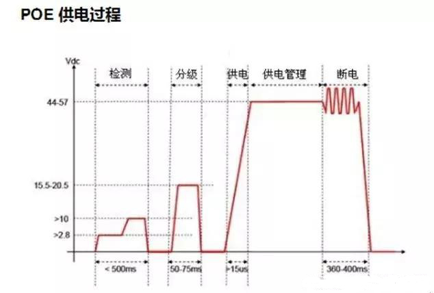 5、断电: 若PD设备从网络上断开时,PSE就会快速地(一般在300~400m之内)停止为PD设备供电,并重复检测过程以检测线缆的终端是否连接PD设备。