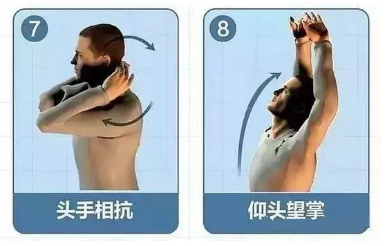 7、双手交叉紧贴颈后,用力顶头颈,头颈向后用力,相互抵抗5次。