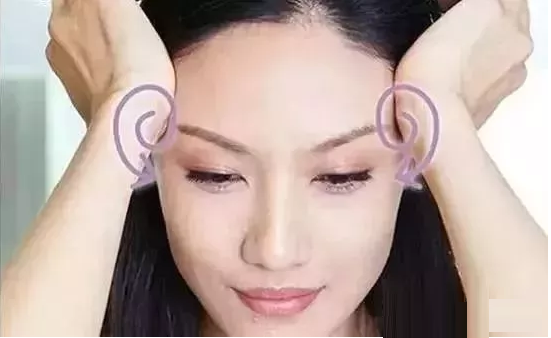 做法:双手拇指分别放在额部两侧的太阳穴处,其余四指微分开,放在两侧头部,双手同时用力做对按揉动20~30次。
