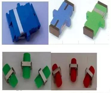 上图是各种光连接器与之对应的适配器,也称法兰盘,用在ODF架上,供光纤连接。