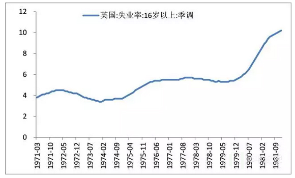 70年代,英国遭遇了长达10年的高失业率与高通胀共存的“滞胀”现象。外部因素如石油危机引起的油价飞涨,固然是英国高通胀的重要原因之一,但其内部因素更加重要。面对经济低迷,英国政府采取凯恩斯的需求刺激政策,财政和货币政策双宽松,变相债务货币化,致使通胀不断攀升。另外,英国工会滥用劳资谈判的权力,过度追求工资增长,导致英国工资水平与通货膨胀间的螺旋式上涨。1974-1980年间,英国GDP增长率平均只有1.0%,而通货膨胀率平均达到15.9%。同时,英国的失业率却不断攀升,从70年代初的3.8%上升至70年代末的5.5%,80年代初更是攀升至11.9%,致使经济深陷滞胀泥潭。