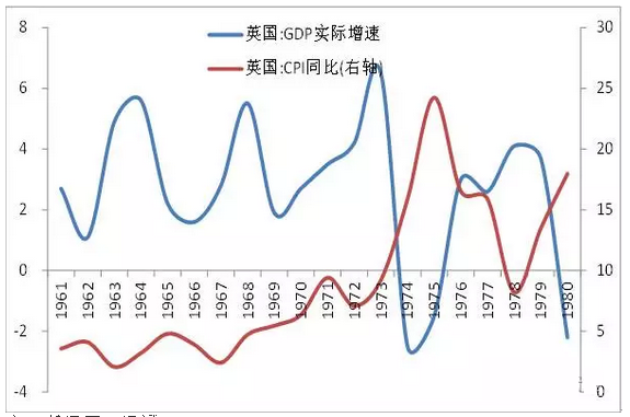 1973年第一次石油危机爆发,布雷顿森林体系瓦解,全球经济陷入衰退,导致英国低增长、高失业、高通胀、国际收支恶化等经济矛盾激化。面对危机,英国工党政府依然采取凯恩斯主义的宏观调控政策,试图通过逆周期的财政和货币政策刺激需求来降低失业率,推动经济复苏。但是英国经济面临的是供给侧的结构性问题,需求侧的刺激不但没有改善经济,反而造成英国长期持续的经济滞涨。
