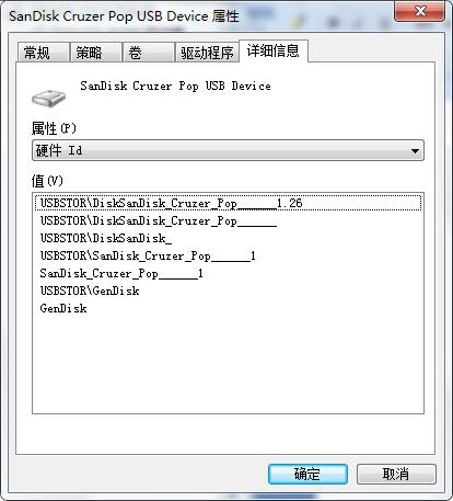 3) 在详细信息里面找到硬件Id,然后选择第一个值,因为这个指包含了这个U盘的所有的硬件Id信息,然后把这个值复制下来,记录好USBSTORDiskSanDisk_Cruzer_Pop______1.26(这是我的Id值)