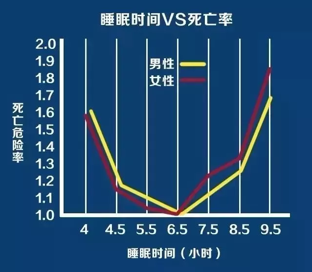 图片显示:成年人睡眠时间在6.5—7.4小时之间,死亡率最低,而少于4.5小时或高于9.4小时,死亡率明显增高。