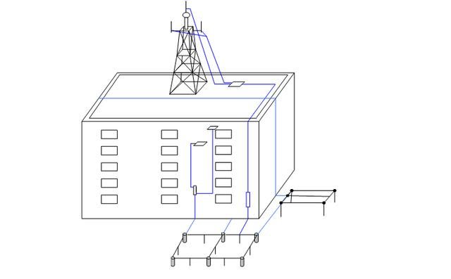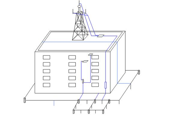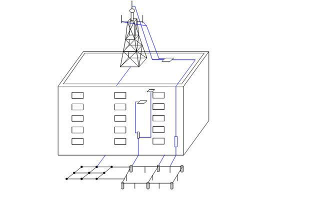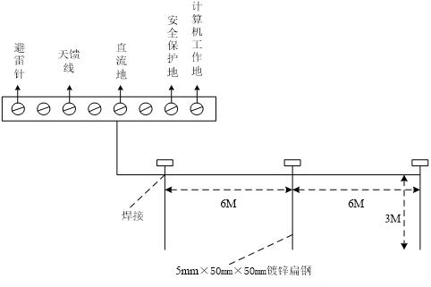 首先在楼顶铁塔的基脚处南北或东西方向置180°两处与楼顶避雷带相连,连接材料为40×4mm镀锌扁钢,利用建筑主钢筋多处泄放雷电流,并在楼下合适的位置建一地网,地网建成以后利用扁钢与建筑主钢筋两处焊接组成联合地网,从地网相距5m以上的位置抽两个头引出地面1.5m处做断接点,分别作为避雷针、机房工作保护接地引入线的接地点,机房内设置设备工作保护接地汇集线,其接地引入线接机房工作保护接地点;雷电流引下线下端接避雷针接地点,上端在楼顶与楼顶接地汇集线相连。接地引入线采用40×4mm镀锌扁钢或95mm2多股铜芯线。
