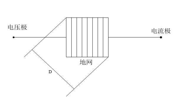 按上图布置测得的接地电阻误差应在1%以内。在土壤电阻率较均匀的地区,电流极到地网的距离取2D,电压极到地网的距离可取D。在土壤电阻率不均匀的地区,电流极到地网的距离应取3D,电压极到地网的距离应取1.7D。