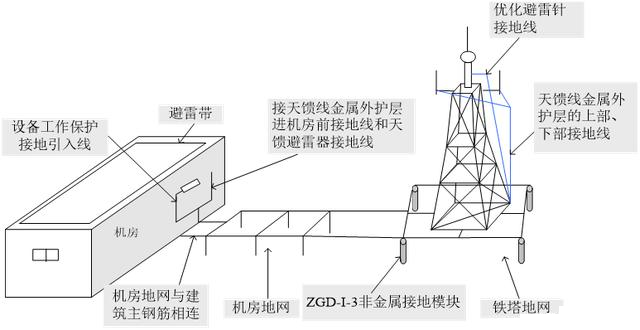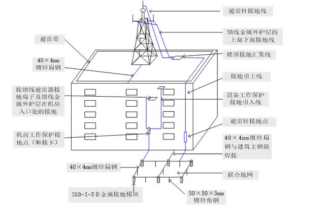 1)楼顶建铁塔,机房所在建筑物女儿墙上有避雷带,市电引入机房