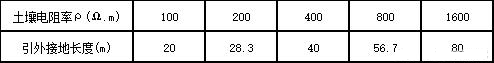 2) 由表1可知,在土壤电阻率很高的山区,仅仅依靠扩大接地网的面积很难达到所要求电阻(增加垂直接地体的长度对地网电阻率影响很小)的情况下,应采取引外接地方法。即移动基站设在高电阻率地山上,如附近有可资利用的导电良好的土壤及低电阻率地层(河流及其它)时,采用延伸接地体作为移动基站本身地网的辅助接地网;引外接地的极限长度应小于2√ρ(ρ为土壤电阻率),根据此公式计算不同土壤电阻率的引外接地的极限长度见表2。