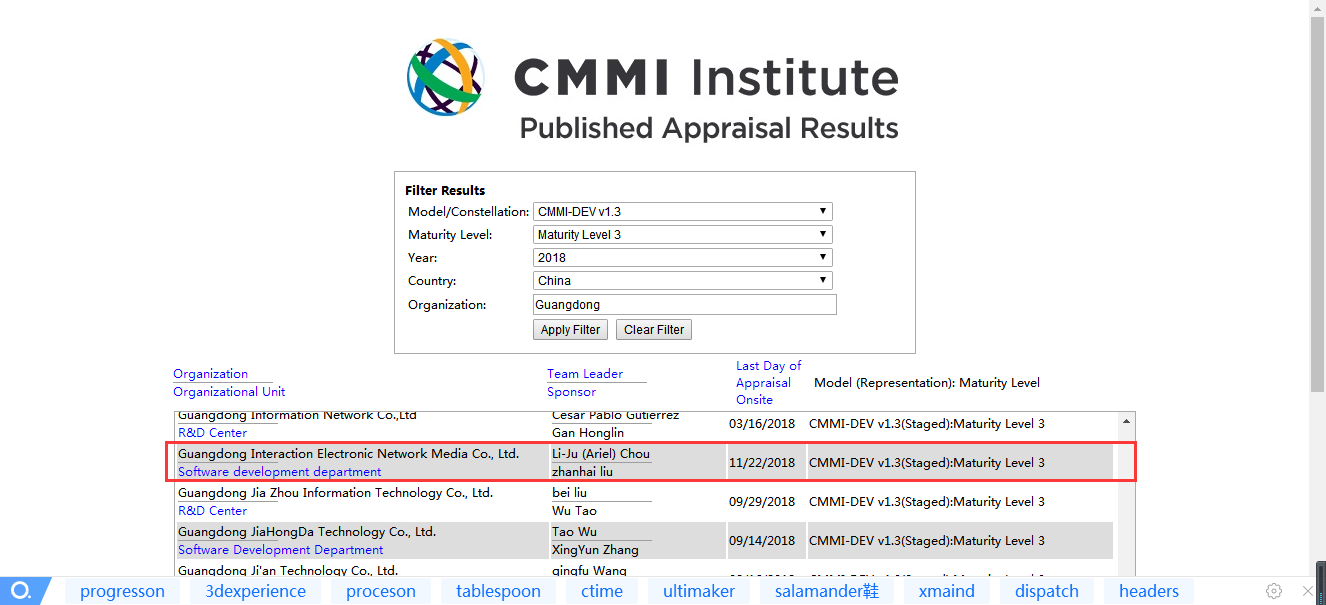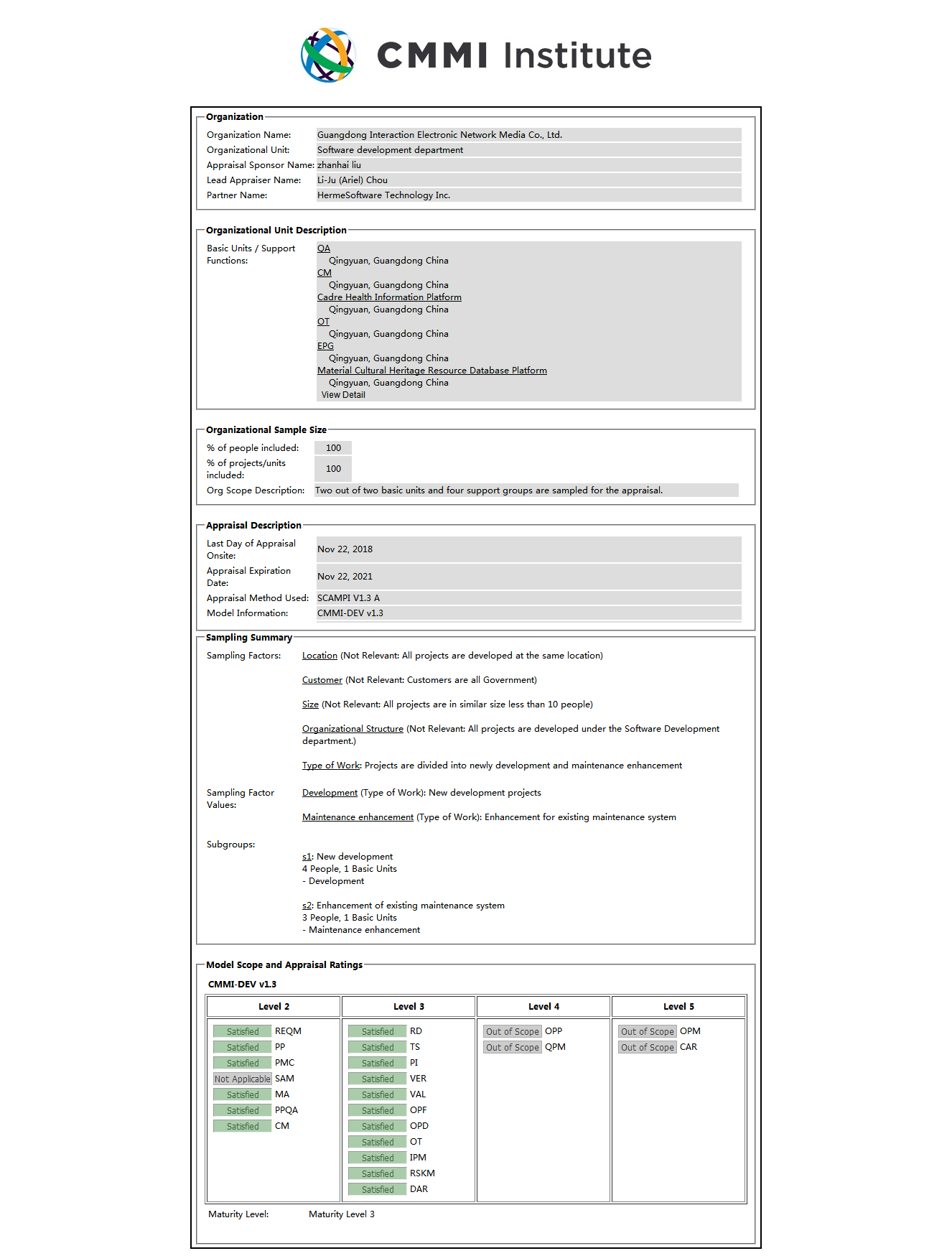 2018年11月23日,经过了为期5天的评估,广东互动接受了主任评估师周立如的亲笔签名验收和祝贺,顺利通过CMMI L3级认证资格。