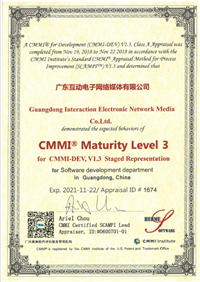 2018年11月23日,广东互动首次取得CMMI L3认证资格。据悉,CMMI(Capability Maturity Model Integration,即能力成熟度模型集成)是目前国际上最流行的软件开发过程标准和软件企业成熟度等级认证标准。