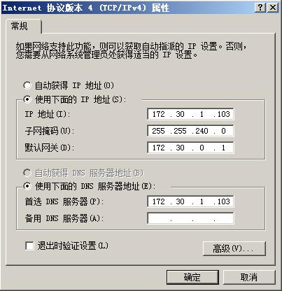 2. 配置固定 IP 地址,首选 DNS 服务器设置为主域控服务器 IP(172.30.1.103),备用设置与自身 IP 一致。