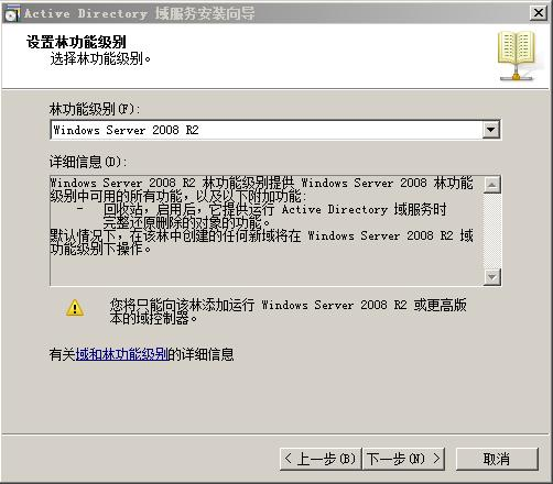 设置林功能级别 → 选择功能级别(例如:windows server 2008 R2) → 下一步