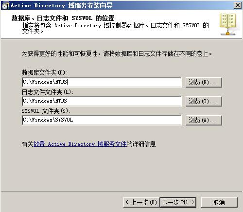 数据库、日志文件和 SYSVOL 的位置 → 下一步