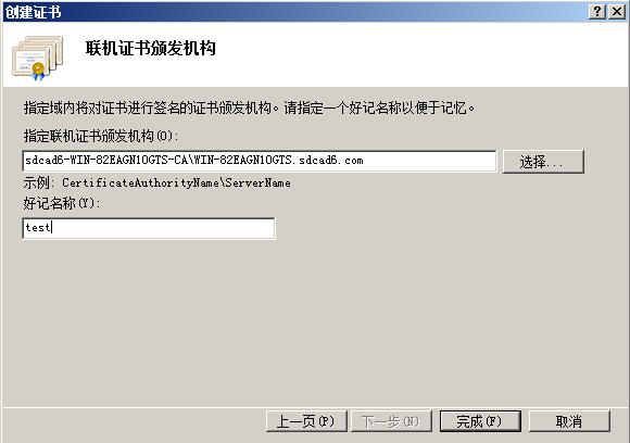 选择本机根证书颁发证书(定义一个名称,该名称会作为后续绑定操作中 SSL 证书选择的名称,例如:test) → 完成