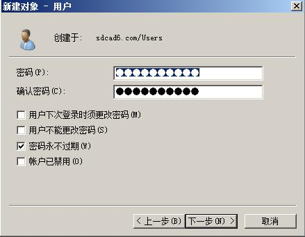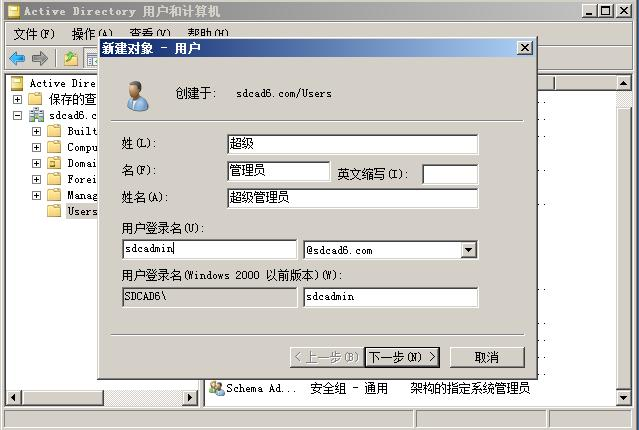 填写姓名、用户登录名等。(例如:超级管理员,sdcadmin),设置密码,分配权限(添加 Domain Admins 权限)